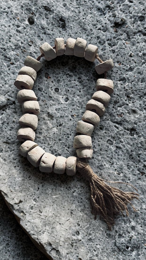 Bohem tarzda gri ve beyaz renkli, doğal püsküllü tesbih. Boncuklar rustik ve el yapımı .
