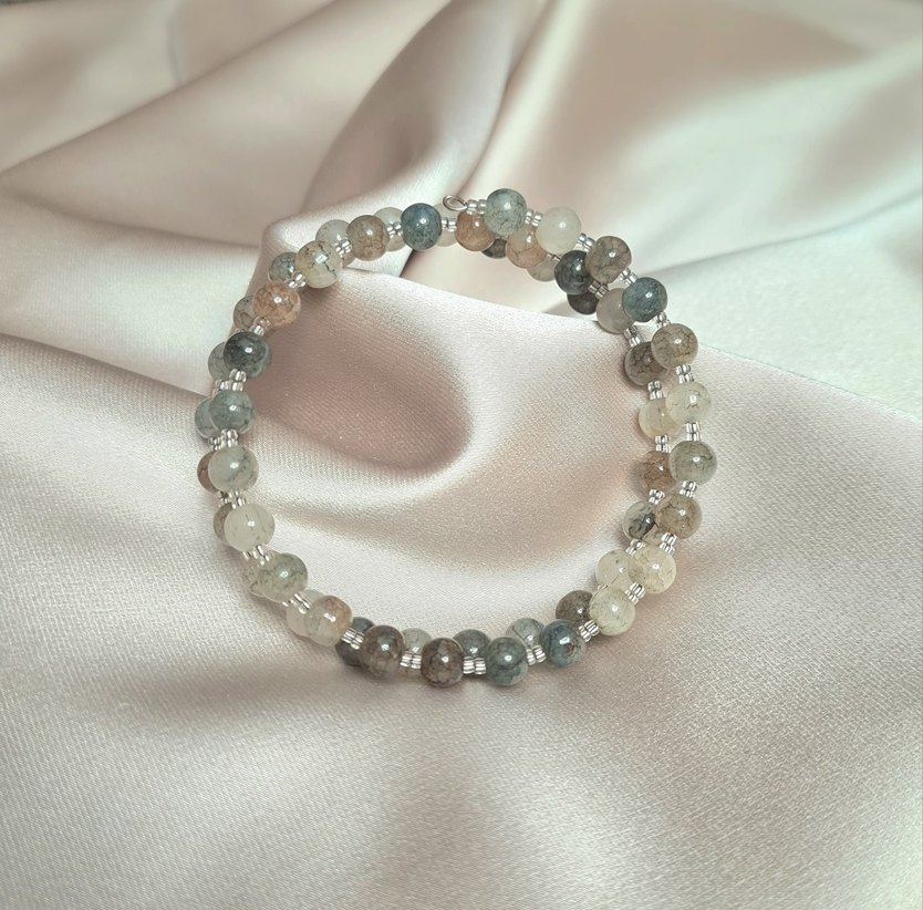 Gri tie-dye desenli boncuklardan oluşan bohem tarzda, günlük kullanıma uygun rahat ve retro görünümlü bileklik.