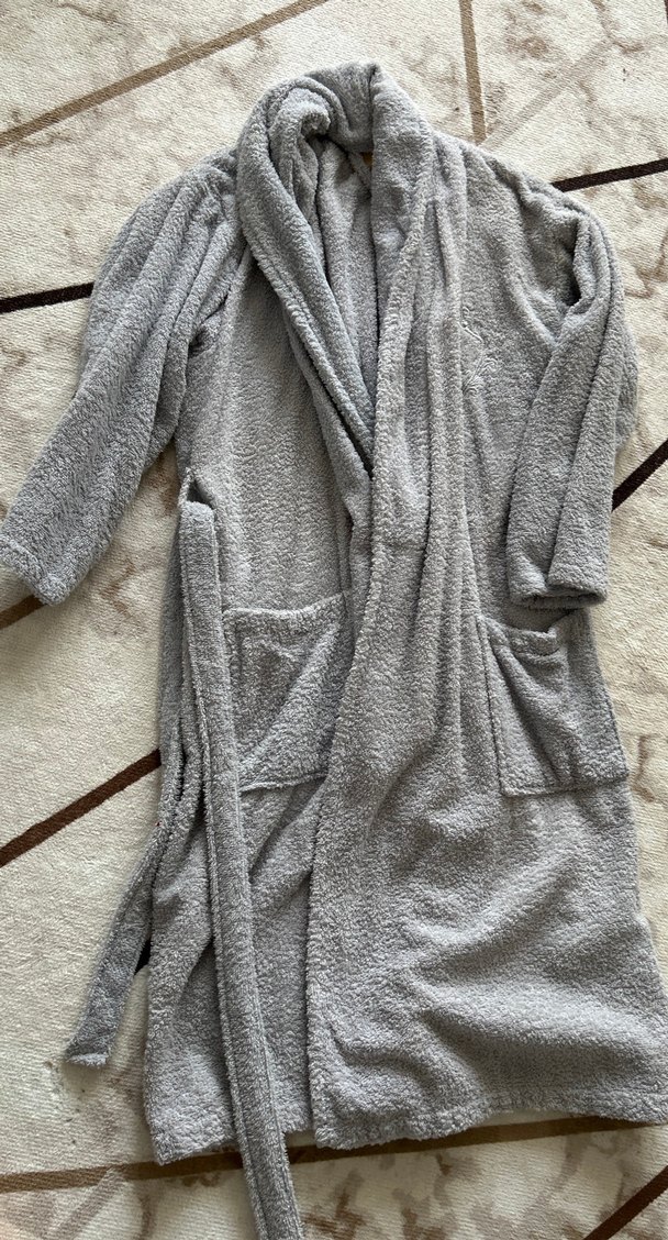 Bohem tarzda, cepli, desensiz yumuşak ve rahat gri bornoz.