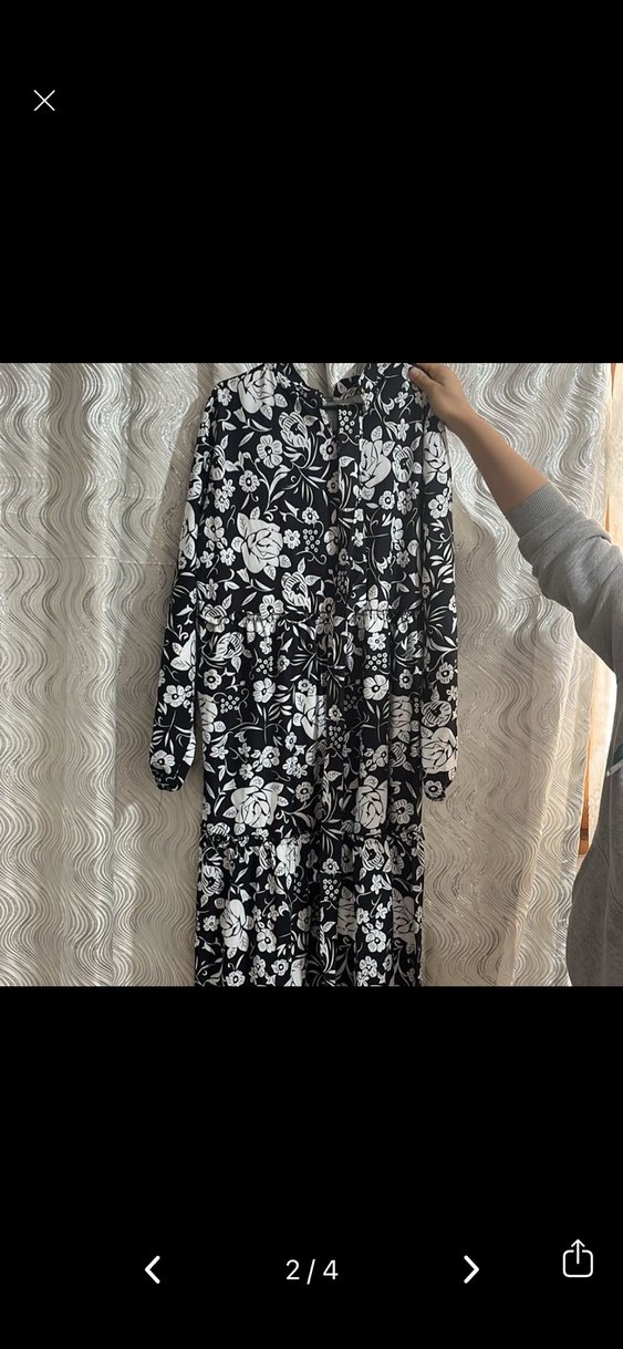 Uzun, bol kesim gri elbise, uzun kollu ve yüksek yakalıdır. Düğmeli ön kısmı ve çiçek desenleri vardır, günlük kullanım için uygundur.