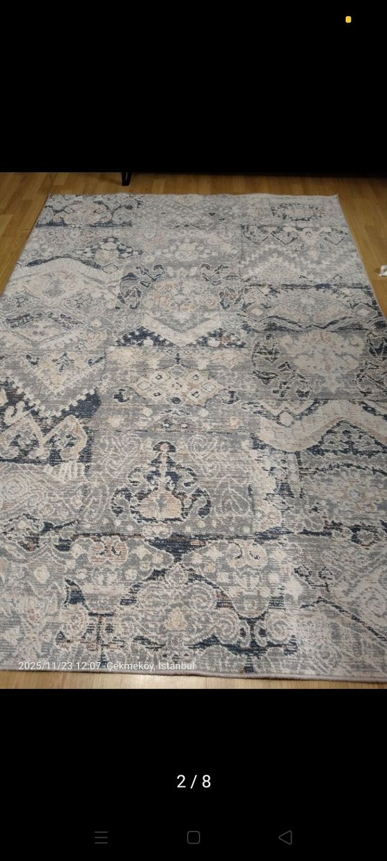 Bohem tarzda, gri tonlarında desenli bir halıdır. Farklı geometrik ve süslü motifler içerir, sanatsal bir görünüm sunar.