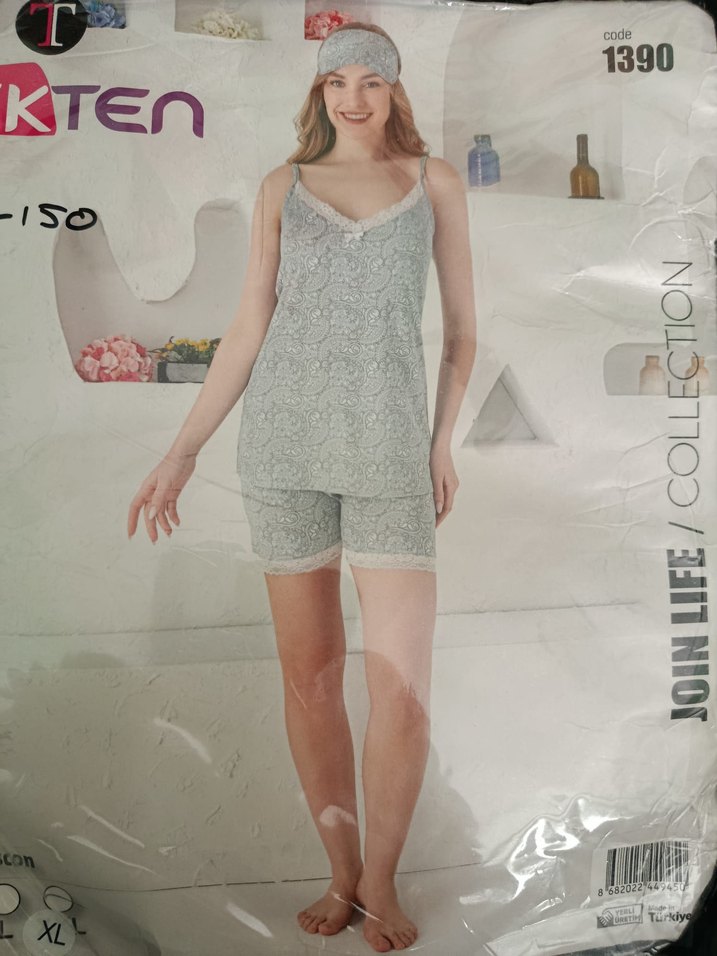 Gri desenli, kolsuz ve bol kesim kadın pijama takımı. Üst ve şorttan oluşan rahat bohem tarz.