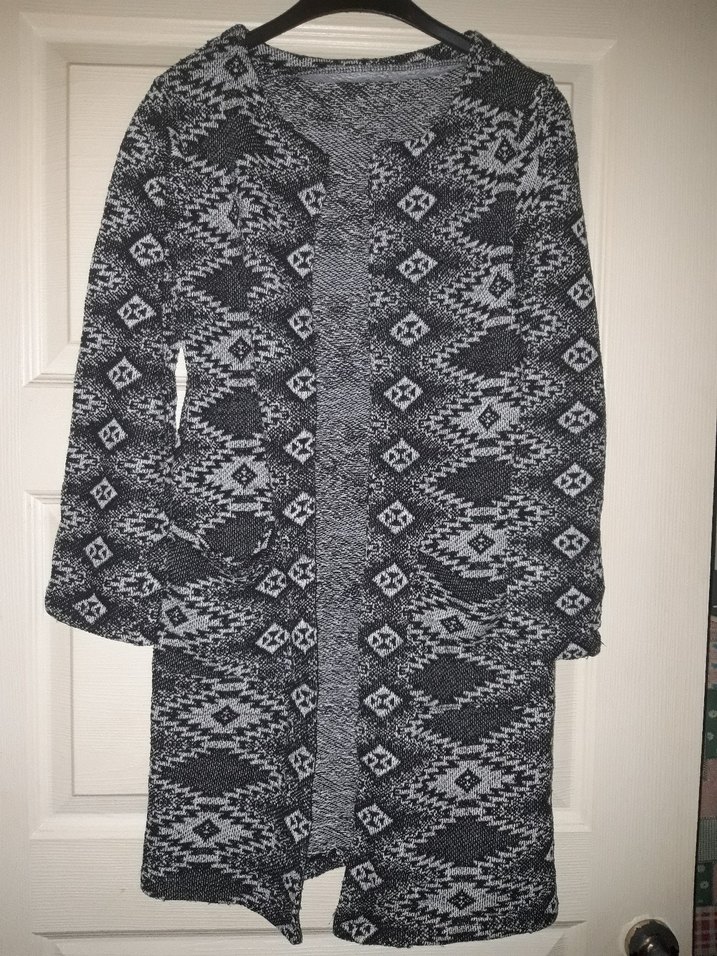 Gri renkli, örgü dokulu, bol kesim uzun kollu midi uzunlukta bohem desenli kadın hırka. Günlük kullanıma uygundur.