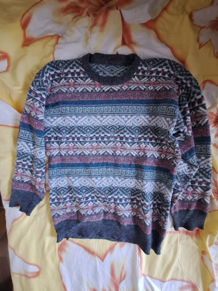 Bohem tarzda, uzun kollu, bisiklet yaka gri desenli triko kadın kazak. Rahat kesimi ve yumuşak dokusuyla konfor sağlar.
