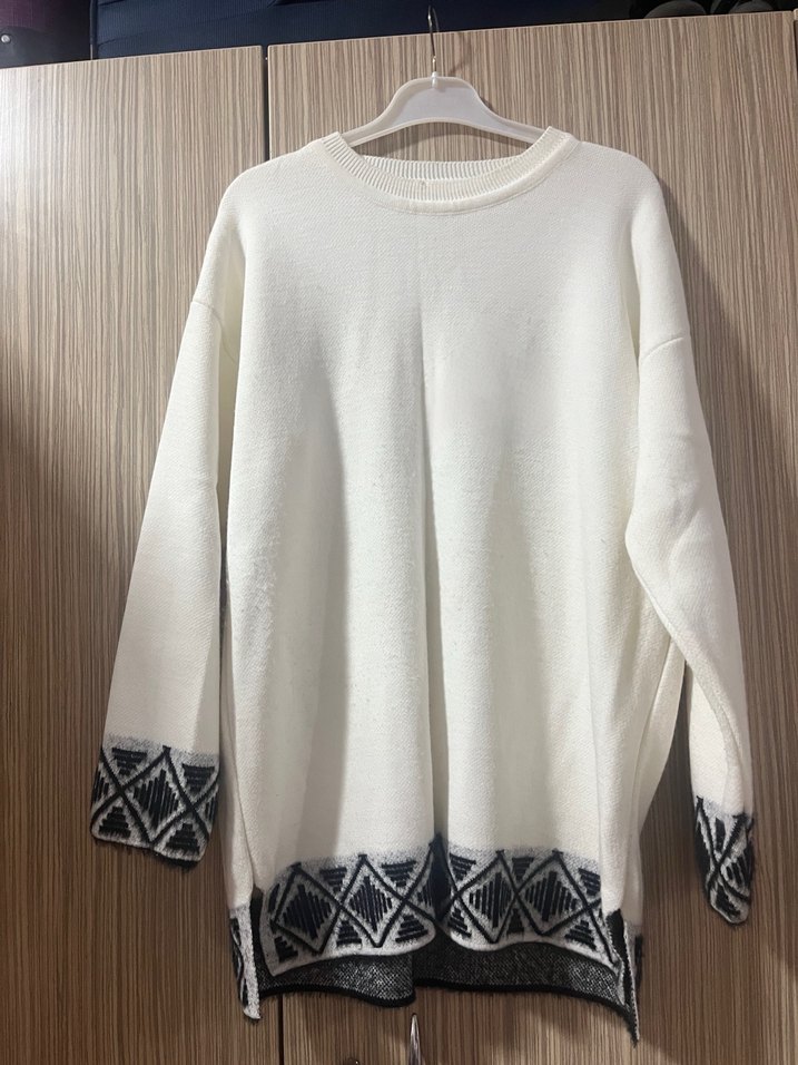 Kadınlar için gevşek kesim, uzun kollu ve yuvarlak yakalı bu kazak, yumuşak örgü kumaştan üretilmiştir. Etek ve manşetlerde gri geometrik desenler bulunur, bohem tarzını yansıtır. Günlük kullanım için uygundur.