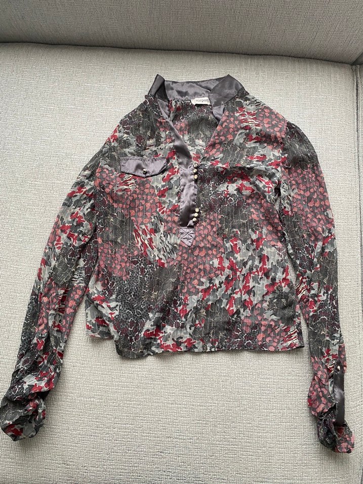 Bohem tarzı, düğmeli ve yakalı, gri desenli, sentetik kumaştan, bol kesim uzun kollu gömlek.