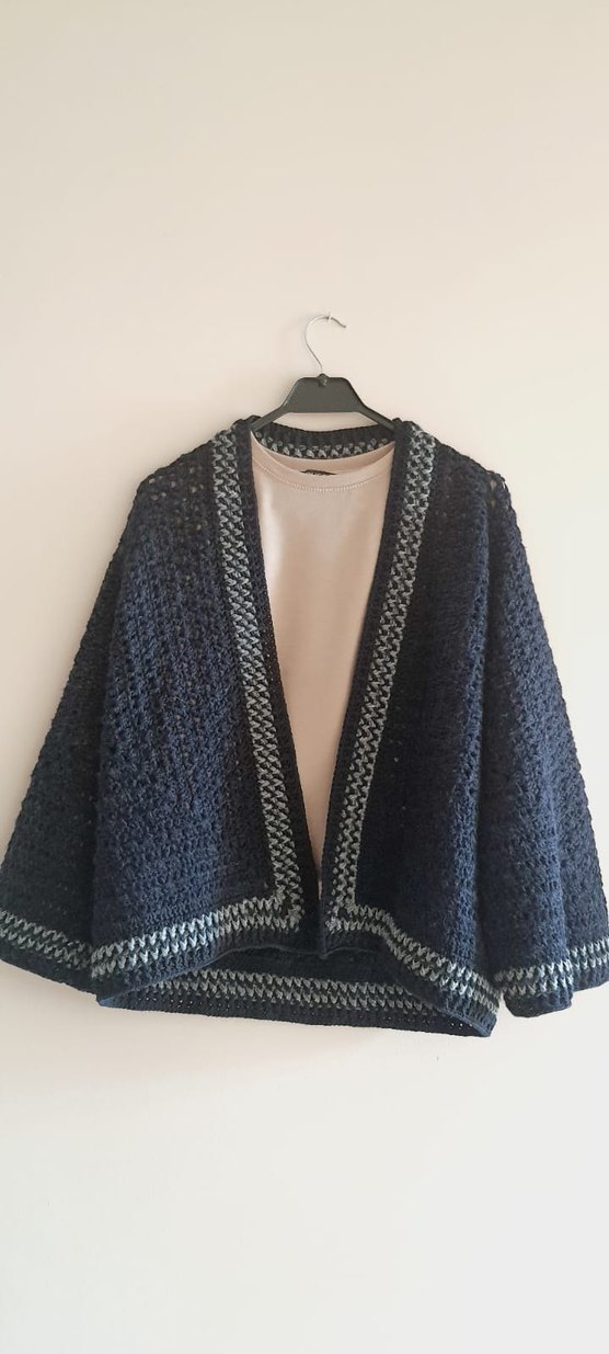 Uzun kollu, yaka detaylı, bol kesim örgü kadın hırka. lacivert renk, gri şeritlerle bohem tarzda, günlük kullanım için uygun.