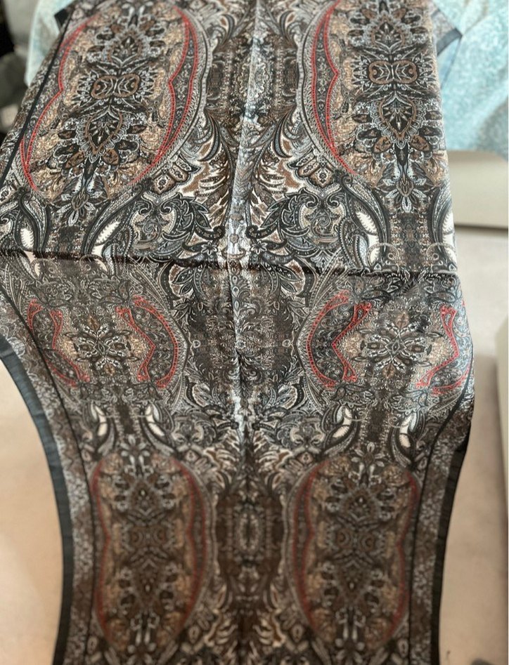 Kadınlar için drapeli, bohem desenli gri ve kırmızı tonlarında şal. Yumuşak sentetik kumaştan retro ve hippie tarzında.