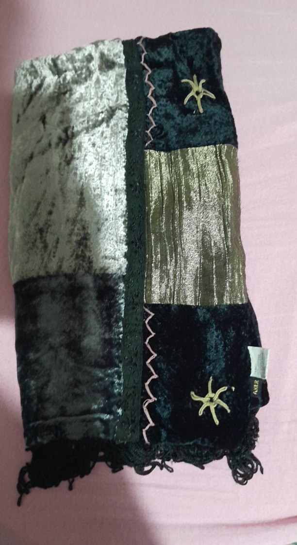Kadın kadife şal, koyu gri tekstil patchwork tasarımına ve drapeli yapıya sahiptir. Gotik ve bohem esintiler taşıyan, işlemeli detaylar ve püsküllü kenarlarla tamamlanmıştır.