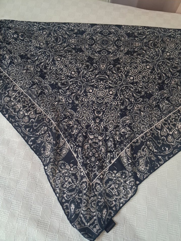 Bohem tarzda, gri renkli detaylı desenli, dökümlü kadın şalı. Retro ve hippie havası taşır.