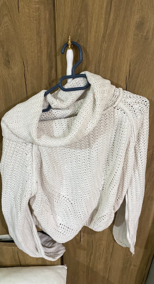 Boğazlı, uzun kollu ve bol kesim gri triko kadın kazak, yumuşak örgü kumaştan, rahat ve bohem tarzda günlük kullanıma uygun.