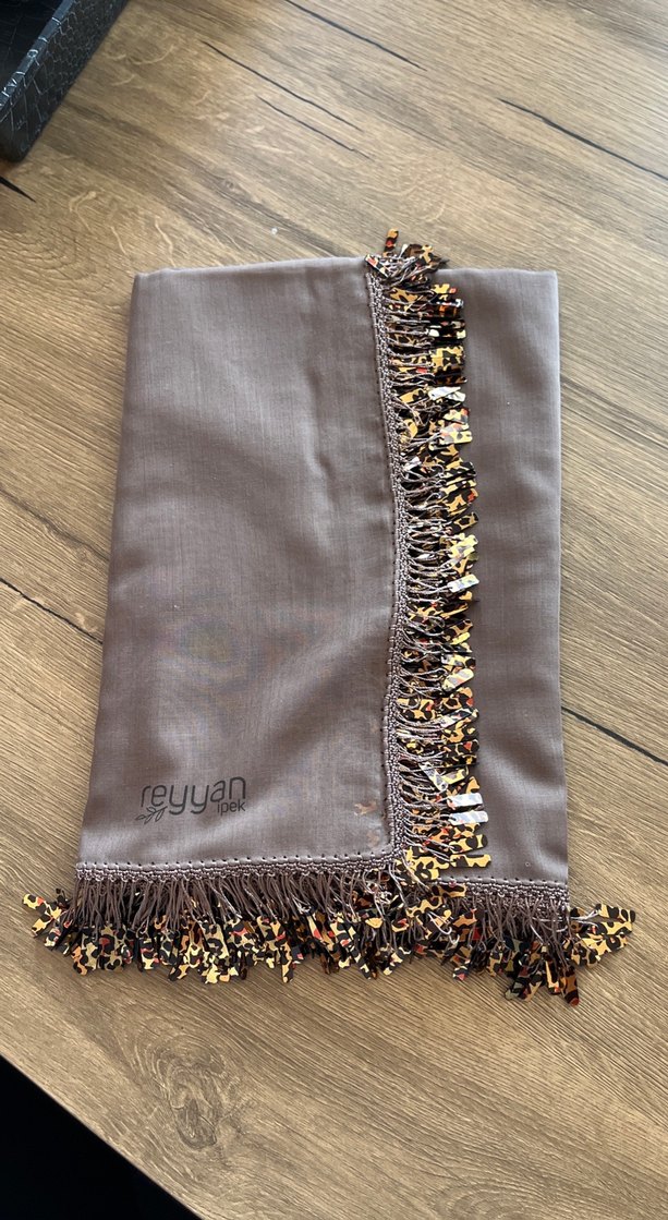 Bohem tarzda, gri ve kahverengi tonlarda, püsküllü dokuma kadın şalı. Rahat ve retro esintili, üzerinde "reyyan" markası bulunur.