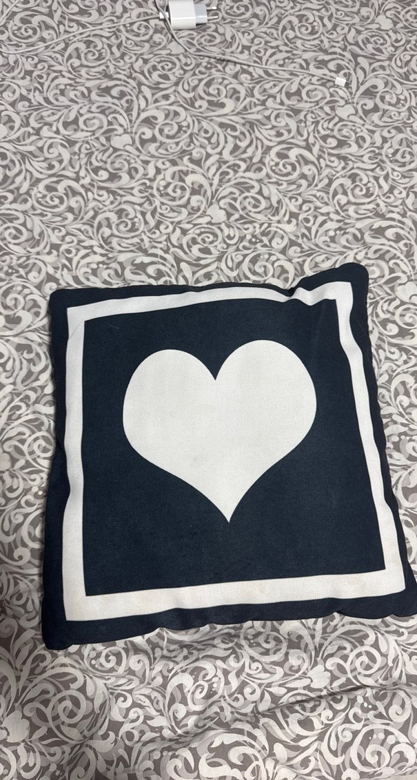 Bohem tarzda, gri renkte, beyaz kalp desenli ve beyaz çerçeveli yastık kılıfı. Ve yastık