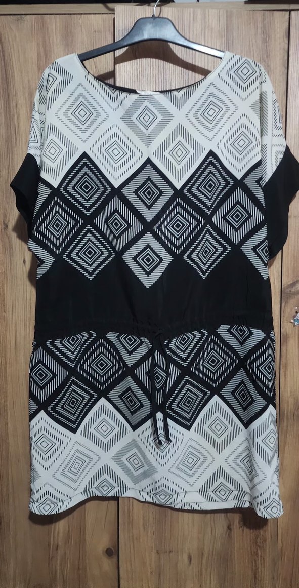 Bohem tarzı, kısa kollu, kayık yaka ve kuşaklı tunik. Gri bağlama desenli, bol kesim, midi boy, yumuşak sentetik kumaştan yapılmıştır. Resimde goruldugu gibi giyime engel bi kusuru yoktur etiketinde 4 no yaziyor tam bedenini bilmiyorum fakat 38 ile 44 beden arasi olur gibi duruyor