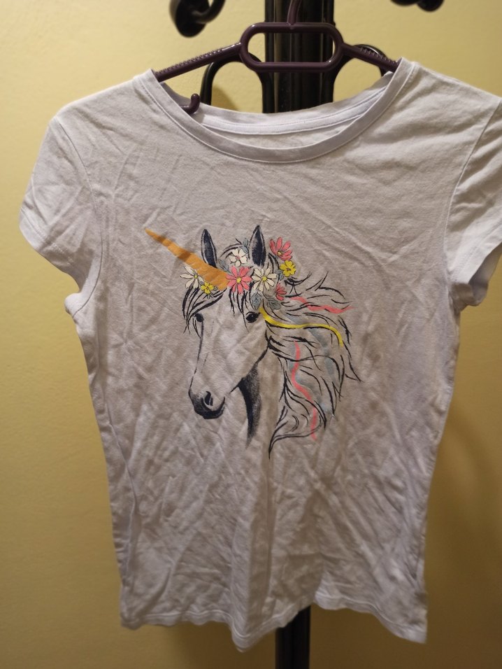 Gri renkli, pamuklu kumaştan yapılmış bohem tarzda kız tişörtü. Kısa kollu, yuvarlak yakalı ve rahat kesimli, renkli unicorn baskısı bulunur.
