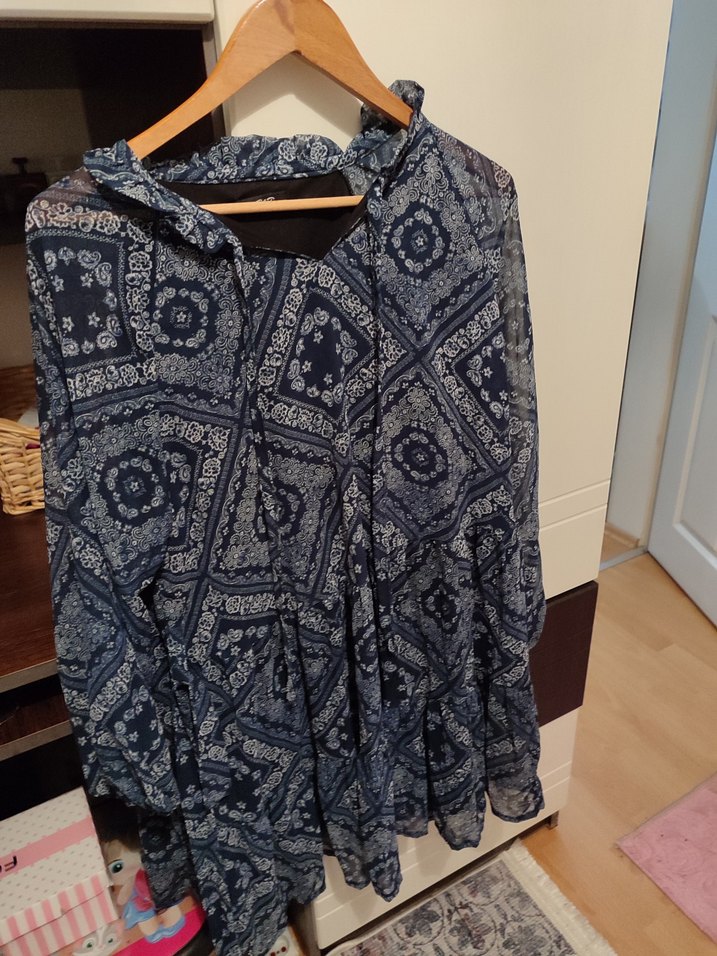 Gri ve mavi bağlama desenli, uzun kollu, yüksek yakalı, bol kesim hamile tunik. Midi boy ve bohem tarzda, günlük kullanım için uygun.
