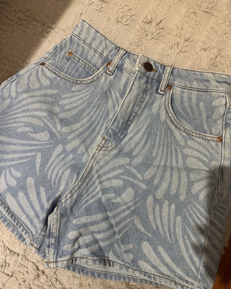 Gri ve mavi bağlamalı desenli, kürk detaylı bol kesim mini denim şort, bohem tarzı yansıtır.