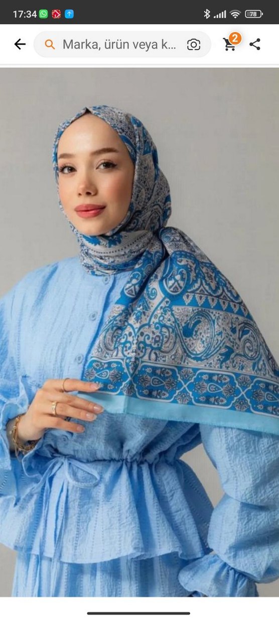 Mavi ve gri tonlarda, ipek görünümlü, bohem tarzda, drapeli kadın başörtüsü.