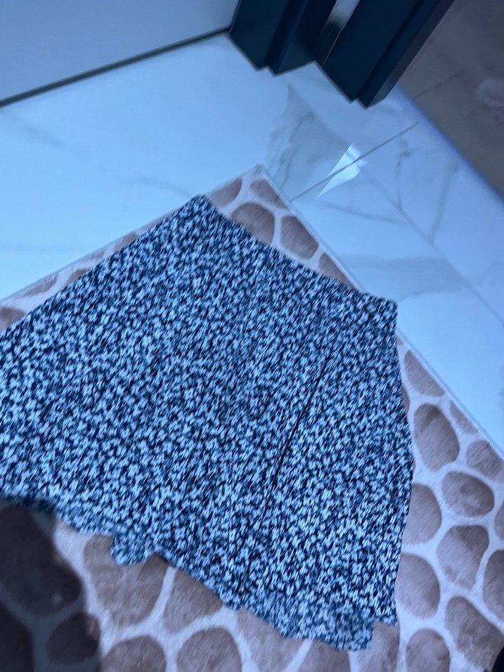 Gri ve mavi tie-dye desenli, örme ve bol kesim hamile eteği. Rahat bohem tarzı ve kısa boyu ile dış mekan kullanımı için uygun. Şortlu etek