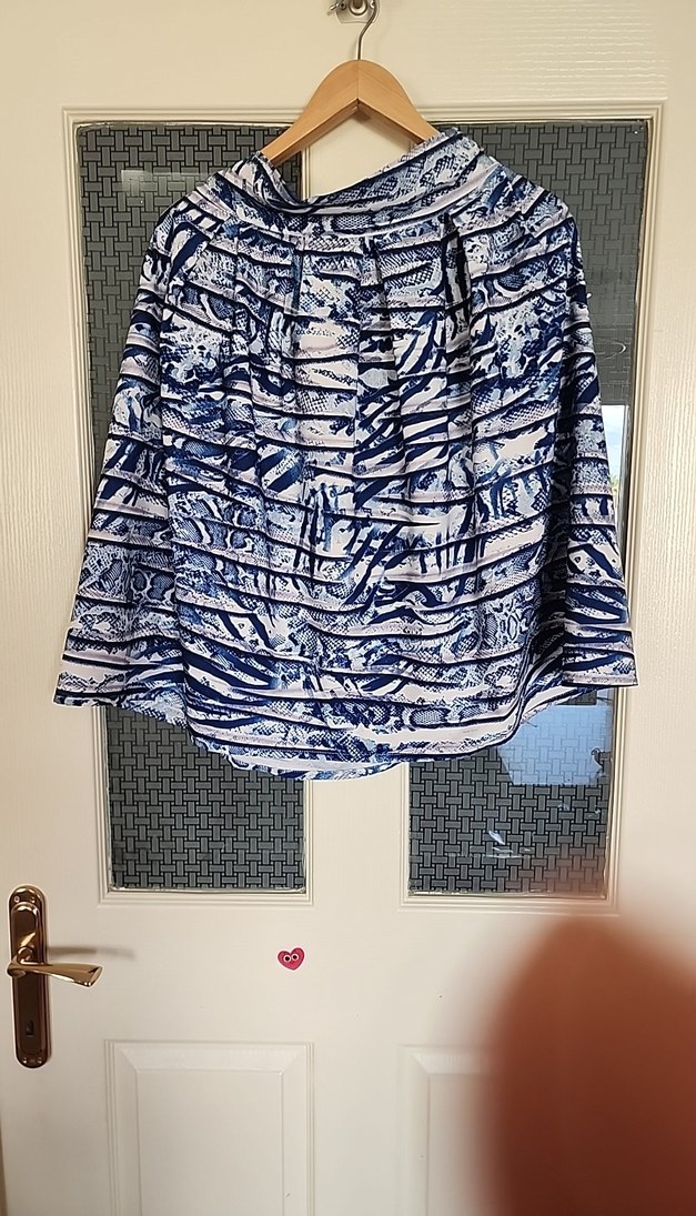 Bohem tarzda, gri-mavi batik desenli piliseli, bol kesim minietekGünlük kullanıma uygun kısa boyda.