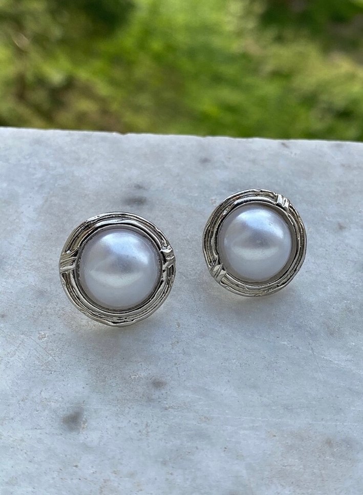Romantik akşamlar için bohem tarzda, gri düğmeli inci detaylı midi uzunlukta kadın küpeler. Minimalist ve şık tasarım sunar.