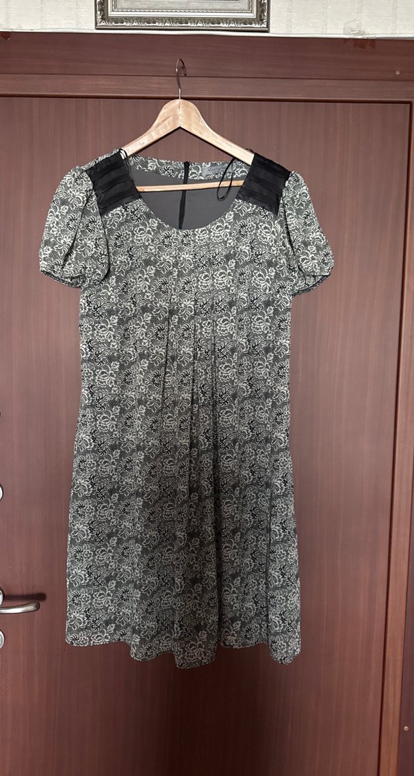 Gri midi elbise, bol kesim, kısa kollu ve yuvarlak yakalıdır. Çiçek desenli ve pliseli detaylara sahip bohem tarzda, günlük kullanıma uygundur. Hamile elbisesi şifon abiye elbise olarak da kullanılabilir ofis kullanımına da uygundur