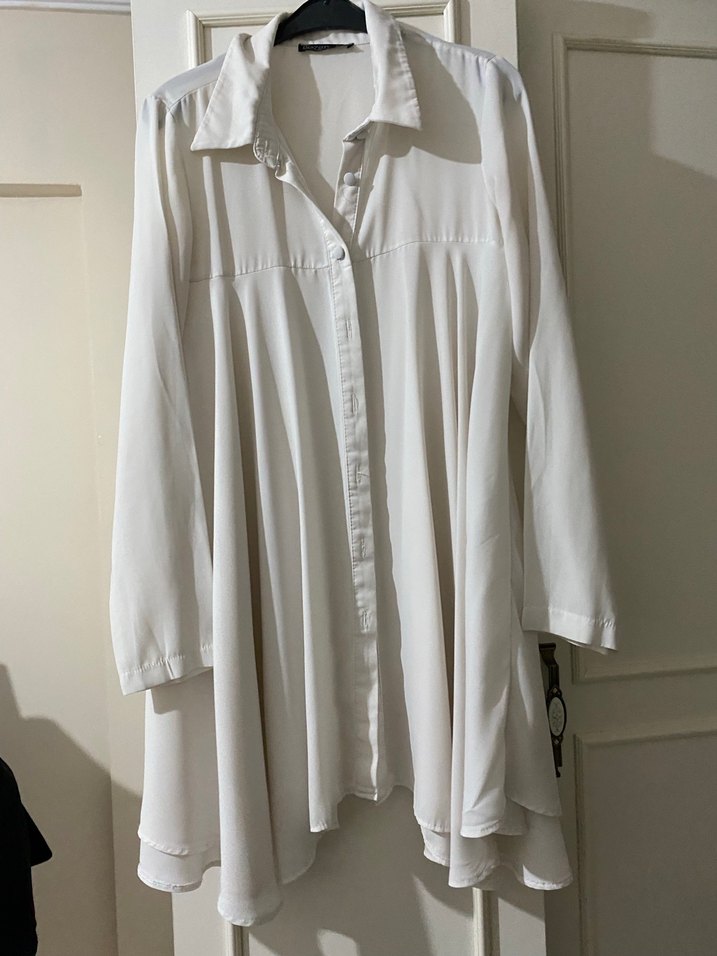 Bohem tarzda, düğmeli, uzun kollu keten gömlek. Midi boyda, bol kesim ve Paris esintili sade gri renk.