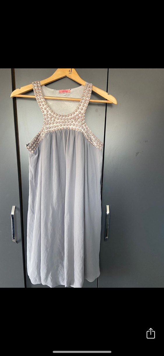 Kolsuz, straplez yakalı gri midi elbise, bol kesim ve drapeli kumaşıyla bohem parti stili için uygundur.
