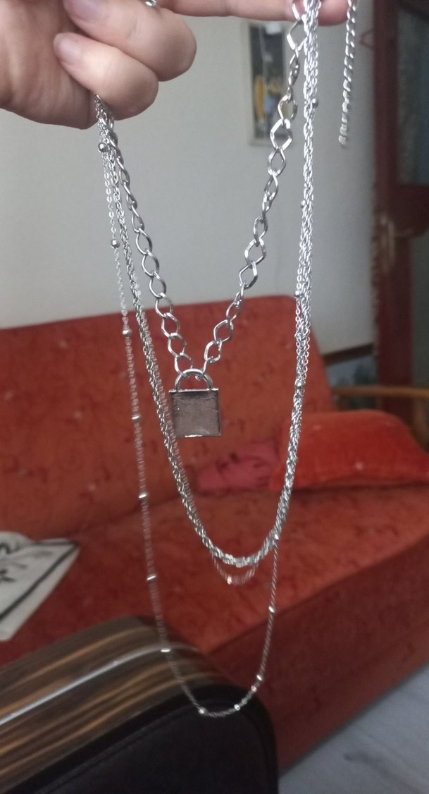 Kadınlar için çoklu gri zincirler ve küçük kilit kolye ucu ile bohem tarzı, minimalist rock punk havası taşıyan kolye. Katmanlı tasarım sade ve dikkat çekici.