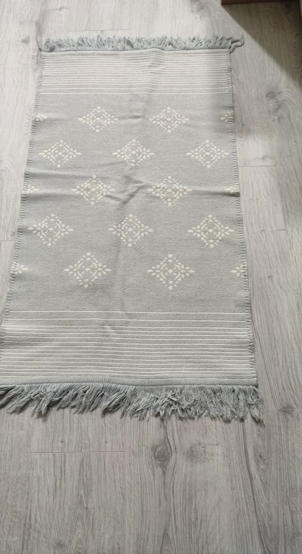 Bohem tarzda gri renkte, nakışlı desenlere ve püsküllü kenarlara sahip yumuşak dokulu halı.
