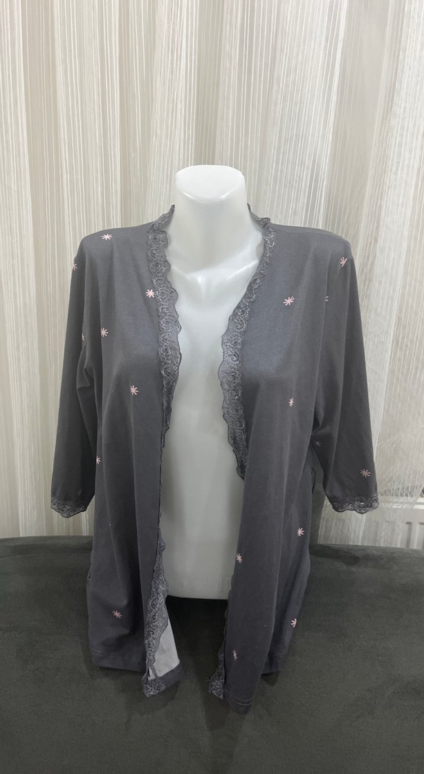 Uzun kollu, bol kesim gri kadın sabahlık, bohem tarzda nakışlı çiçek detaylarıyla rahat bir kullanım sunar.