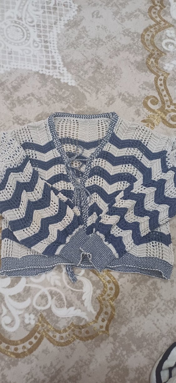 Gri renkli, nakışlı ve örgü dokulu kadın kazak, bol kesim ve uzun kollu. V yaka ve kısa boy ile bohem tarzı yansıtıyor.