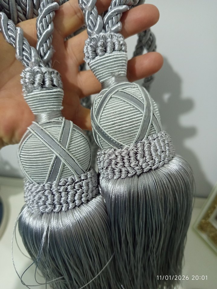Bohem tarz gri perde bağları, detaylı nakış ve yumuşak püsküllerle süslenmiştir. Her pencereye dekoratif bir dokunuş katar.