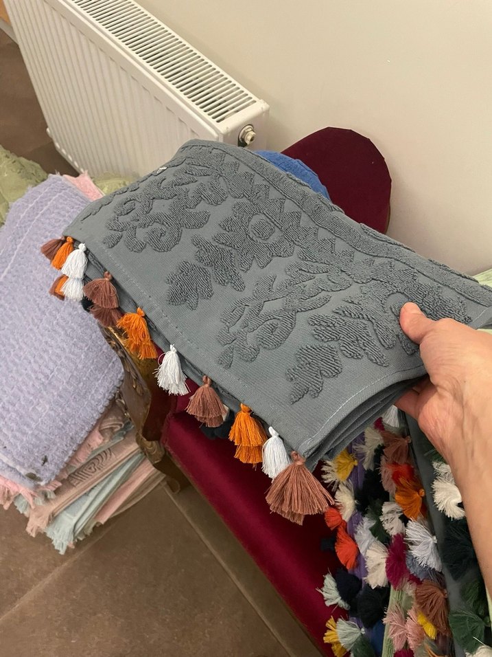 Gri renkte, nakışlı desenleri ve renkli püskülleriyle bohem tarzı sunan yumuşak dokulu havlu.