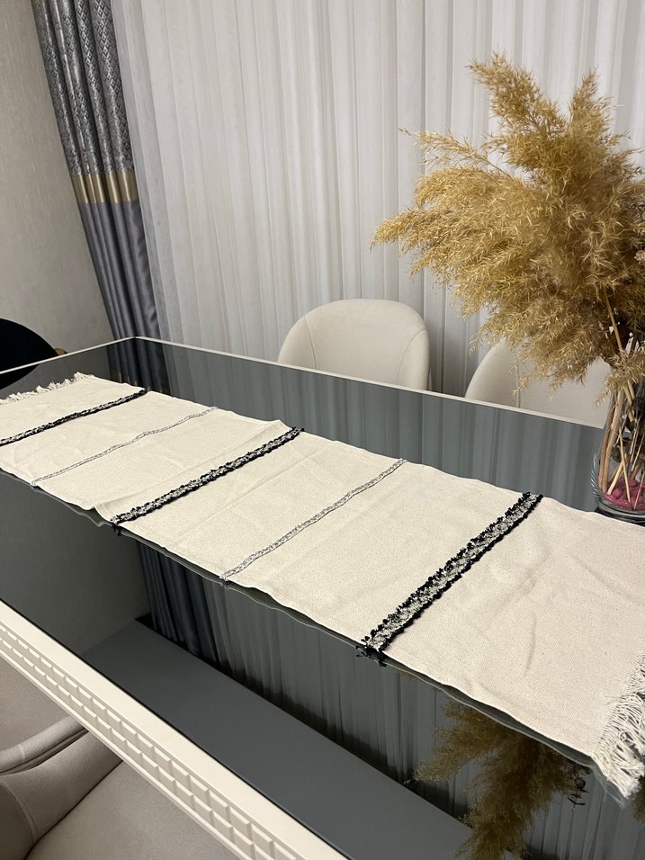 Bohem tarzda, keten kumaş zemin üzerine gri nakışlı deseni olan runner .Hafif kumaş ve püsküllü kenarlarıyla rustik bir hava katıyor.