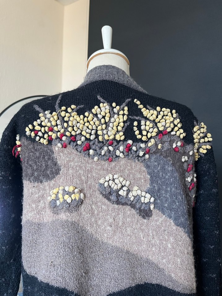 Bohem tarzda, gri tonlarda yün kumaştan yapılmış, uzun boy ve bol kesim hırka. Uzun kollu, düğmeli ve nakış detaylıdır. Günlük kullanım için uygundur.