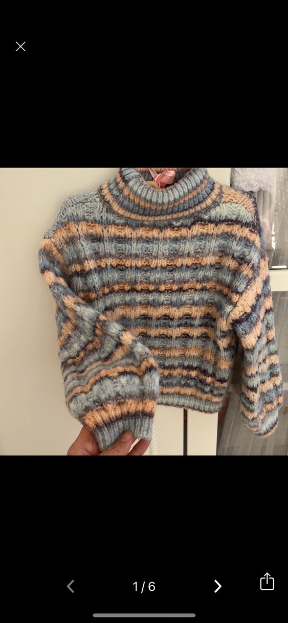 Gri tonlarda bağlama desenli, balıkçı yaka ve uzun kollu, bol kesim örgü kazak. Rahat bohem stil için ideal.