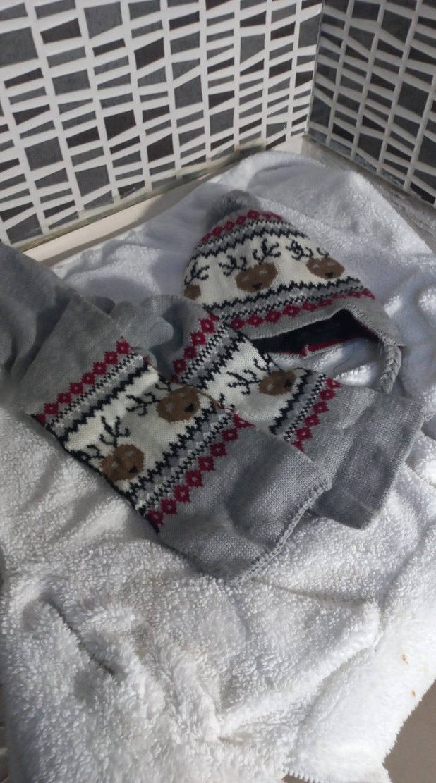 Geyik desenli, bohem tarzda gri örgü çocuk atkısı, rahat ve şık bir görünüm sunar.