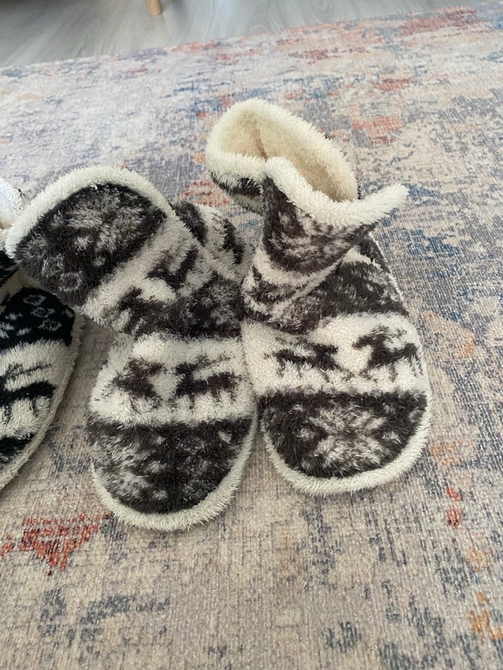 Bohem tarzda, gri bağlama desenli örgü erkek çocuk ev terliği, yumuşak ve sıcak iç yapıya sahiptir.