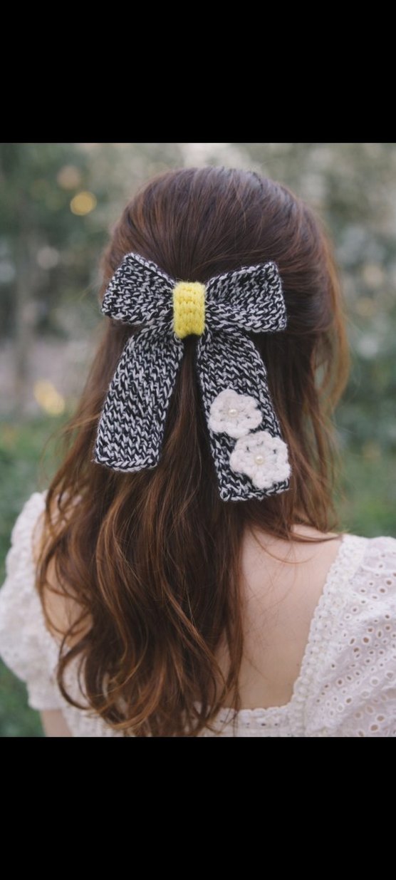 Gri örgü fiyonk saç aksesuarı, sarı merkez ve beyaz çiçek detaylarıyla bohem ve retro tarzı yansıtıyor.