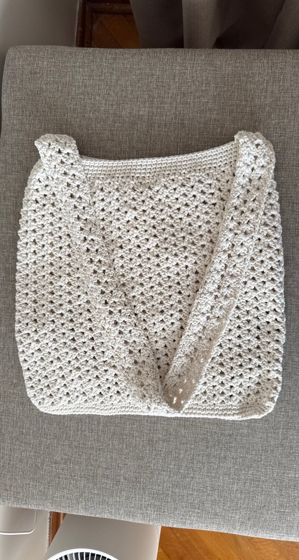 Gri örgü kumaştan yapılmış, dantel detaylı, bohem tarzda kadın çantası. Günlük kullanıma uygun, rahat bir tasarım.