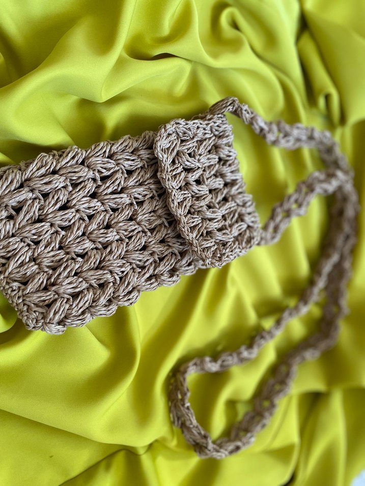 Bohem tarzda, elastik örgü dokulu gri kadın çapraz çanta. Desensiz tasarımıyla günlük kullanıma uygundur.