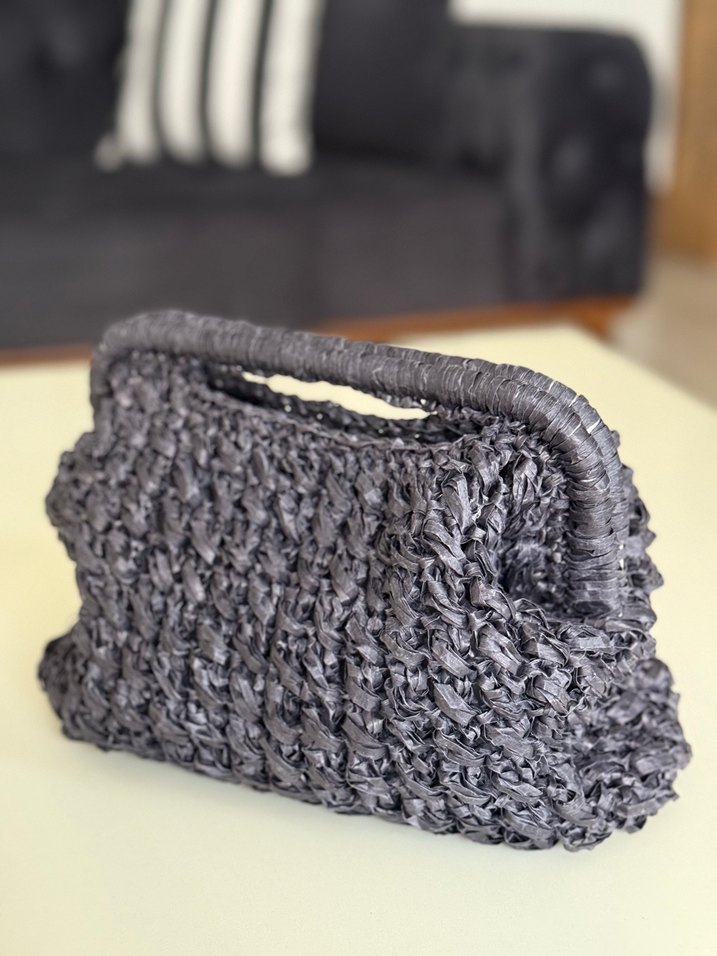Gri örgü dokulu, bohem tarzda, gündelik kullanıma uygun desen içermeyen rahat kadın el çantası.