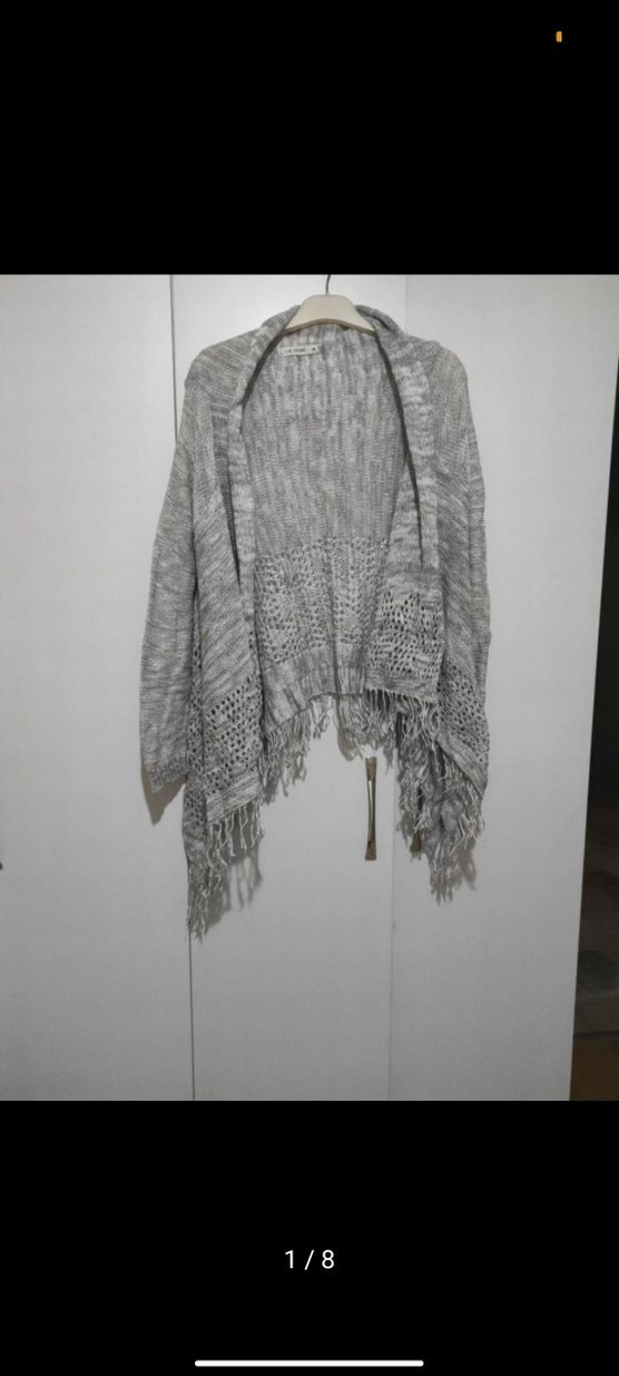 Gri renkli, uzun kollu, bohem tarzda, örgü kumaştan yapılmış, salaş kesim kadın hırka. Saçak detayları bulunur.