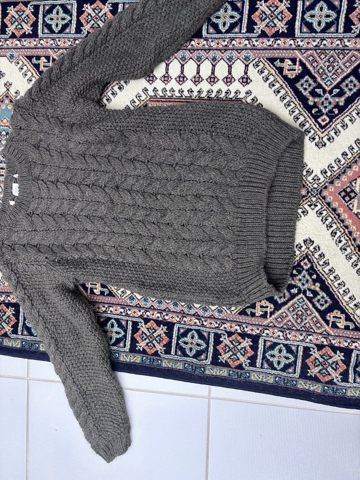 Bohem tarzda, boğazlı ve uzun kollu, gri örgü kadın kazak. Rahat ve bol kesim, günlük kullanıma uygun.