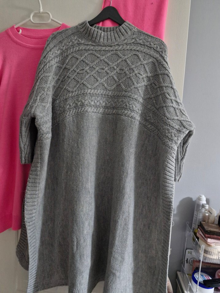 Bohem tarzda, kısa kollu, yuvarlak yaka, gri örgü kumaştan, bol kesim kadın kazak. Üst kısmında dokulu desen bulunur.