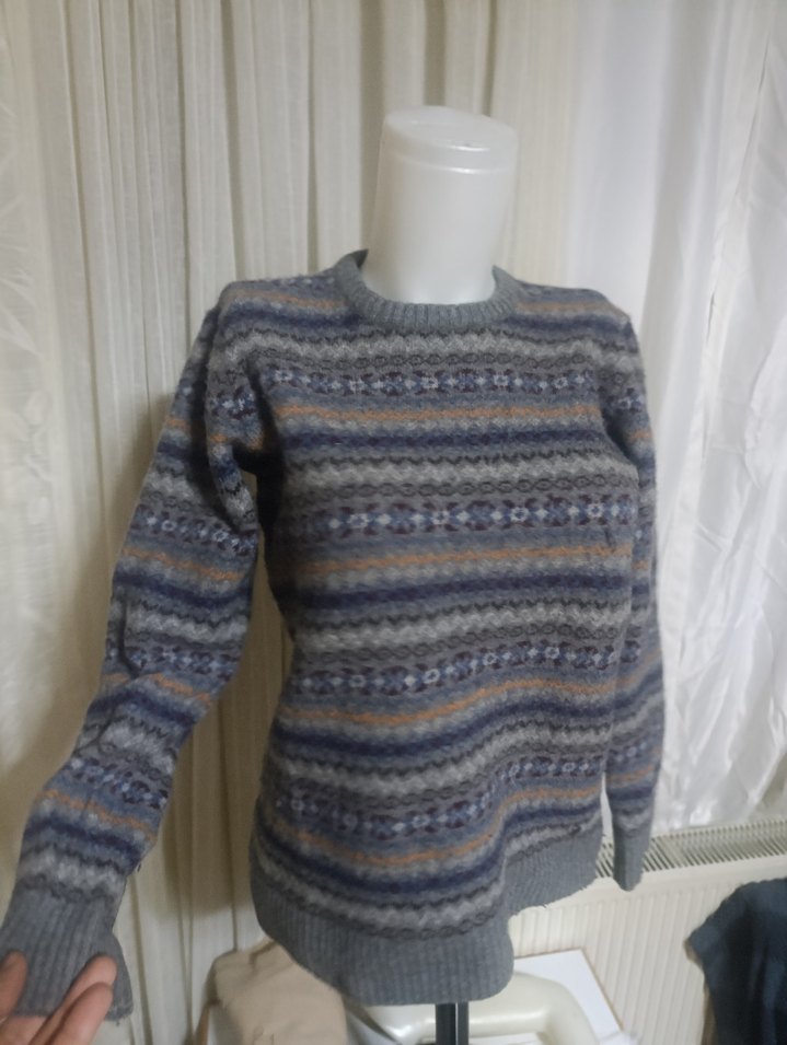 Bohem tarzı, örgü dokulu, yuvarlak yaka ve uzun kollu kadın kazak. Gri çizgili deseniyle rahat ve bol kesim, günlük kullanım için uygundur.