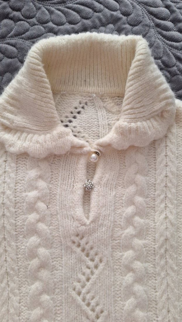Bu dar kesim kadın kazak, örgü dokusu, yakalı ve uzun kolludur. Rahat, bohem tarzda, yumuşak gri renkte ve günlük kullanım için uygundur. Yaka kısmında süs düğmeleri vardır.