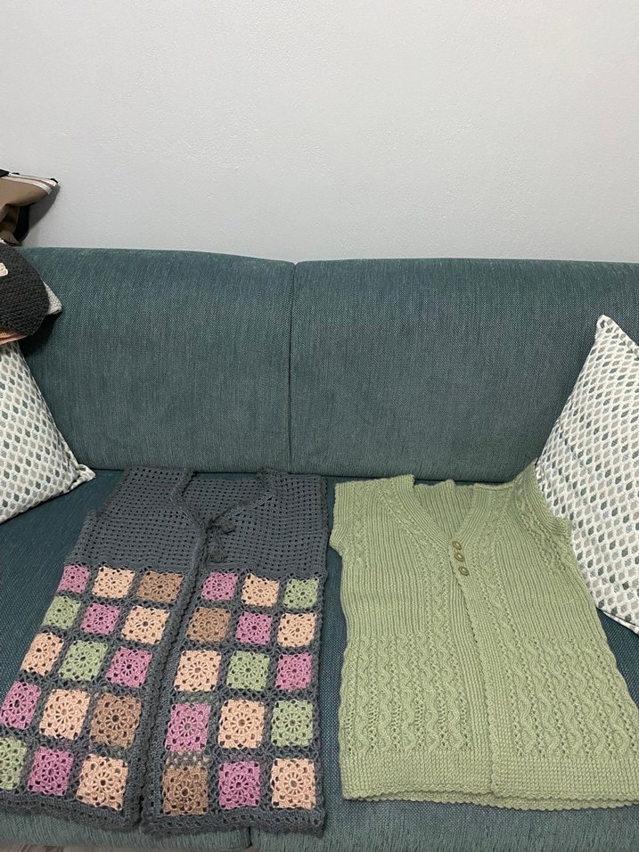 Gri renkte, çok renkli detaylara sahip, bohem tarzda, kısa ve örme kadın süveter. Kolsuz, boğazlı ve rahat kesimdir.