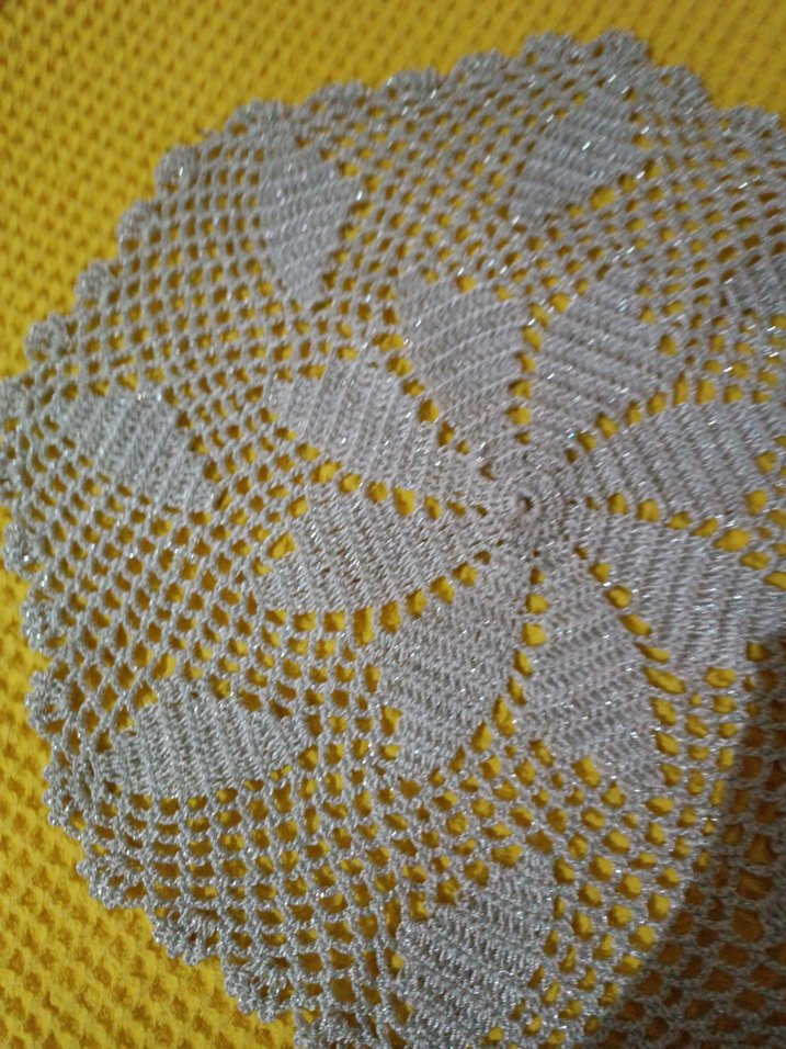 Bohem tarzda gri renkli, el işi örgü masa örtüsü, detaylı desenlere sahip.
